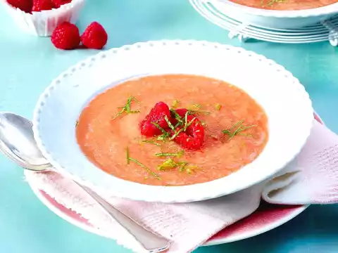 12 raspberries selected. Wash mint, shake dry, pluck leaves and cut into fine strips. Serve the soup in deep plates. Garnish each plate with 3 raspberries, mint and lime zest.