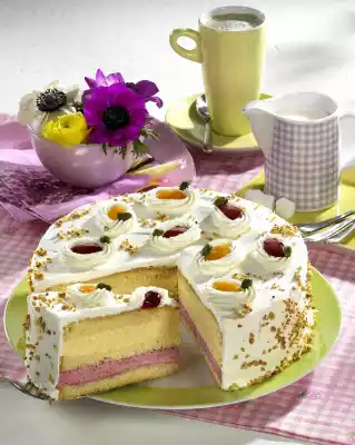 Set 150 ml of each fruit puree aside. Whip 400 g whipped cream until stiff, halve the cream and fold one half into the fruit puree. Spread the raspberry cream on the bottom cake layer and smooth it down. Place the second base on top. Pour peach cream on top and smooth it down. Cover with the third base. Chill for about 3 hours. Roast the almonds in a pan without fat until golden brown. Let them cool down. Remove the cake from the tin. Mix cream firmer with 20 g sugar. Whip 300 g of whipped cream until stiff, allow the cream thickener to trickle in. Spread the cake with 2/3 of the cream. Pour the rest of the cream into a piping bag with a medium star-shaped spout and squirt eggs onto the surface of the cake. Heat the two fruit purees set aside separately. Fill carefully into the egg wells with a teaspoon. Sprinkle almonds over the edge and surface of the cake. Decorate cream eggs with pistachios. Chill for about 30 minutes until the puree has set again