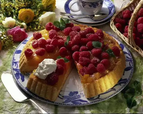 Meanwhile roast the grated coconut in a dry pan until golden brown. Sort the raspberries. Sprinkle the edge of the cake with the grated coconut and spread the raspberries over the cake. Decorate the cake with lemon balm and serve with a dash of whipped sour cream.