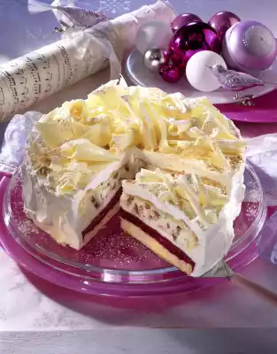 Fold in speculoos. Spread the cream on the raspberry mixture and place the cake lid on top. Refrigerate again for about 1 hour. Whip the cream until stiff, while pouring in 1 sachet of vanilla sugar. Remove the cake ring from the cake. Spread the cake with the cream and put it in a cool place. Form the chocolate coating into rolls with a spatula. Decorate the cake with the spatula and dust with icing sugar and cinnamon