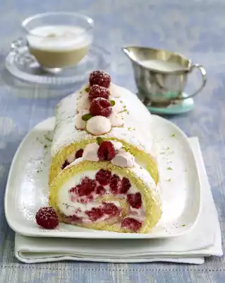 Bake in the preheated oven (electric cooker: 200 °C/ convection oven: 175 °C/ gas: level 3) for about 10 minutes. Turn out onto a tea towel sprinkled with sugar. Carefully peel off the baking paper. Roll up with the cloth from the short side, let it cool down. Defrost frozen raspberries at room temperature. Sort fresh raspberries. Set some aside for decoration. Stir mascarpone and quark until smooth. Mix cream firmer, 75 g sugar and vanillin sugar, stir into the quark mixture. Carefully fold in the raspberries. Roll out the dough sheet.