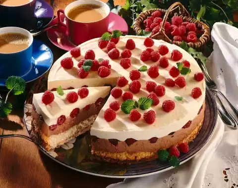 Spread the berries, except for a few for decoration, on the dark cream. Spread light cream on top. Chill for 1 hour. Decorate with the remaining raspberries. Makes about 12 pieces.