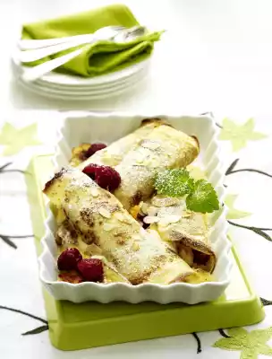 Turn the pancakes after 1-2 minutes and bake until golden brown. Take them out and bake 7 more pancakes in the same way. Separate 2 eggs. Mix 2 egg yolks, cream cheese, 100 g sour cream, 50 g sugar, diced apricots, sauce powder and ground almonds. Beat egg whites until stiff and fold in. Lay the pancakes side by side and spread with the cream cheese mixture. Spread 2/3 of the raspberries on the cream. Roll up the pancakes tightly and place them in 2 small or 1 large casserole dish. Mix 150 g sour cream, 1 tbsp. sugar, vanilla sugar and egg yolk and spread on the pancakes. Bake Crespelle in a preheated oven (electric range: 175 °C/ convection oven: 150 °C/ gas: level 2) for 20-30 minutes until golden brown.