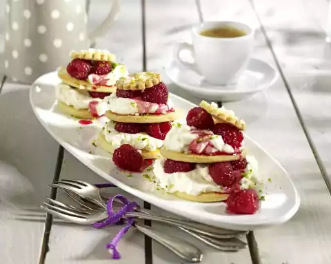 Place on a baking tray lined with baking paper. Whisk 1 egg. Spread the dough circles and flowers with it. Sprinkle with sugar crystals. Bake in a preheated oven (electric cooker: 200 °C/ convection oven: 175 °C/ gas: level 3) for 8-12 minutes, let cool off. Select the raspberries, mix with maple syrup and orange juice. Stir cream cheese and 75 g sugar until smooth. Whip cream until stiff and fold in. Spread the cream on the shortcrust pastry with a tablespoon, add the raspberries. Sprinkle with pistachios.