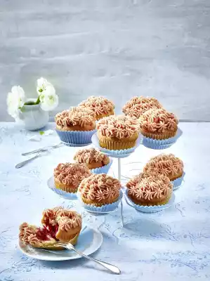 Line recesses of a muffin tray (12 recesses) with paper cups. Fill about half of the dough into the paper cups. Colour the rest of the dough slightly pink with food colouring and spread it over the light-coloured dough.