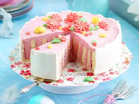 Knead marzipan and approx. 25 g icing sugar and divide into 4 parts. Colour 1/4 tender pink with food colouring, 1/4 strong pink, 1/4 yellow and 1/4 green. Cut out different sized flowers from the yellow and the two pink marzipan pieces. Form small leaves from the green marzipan.