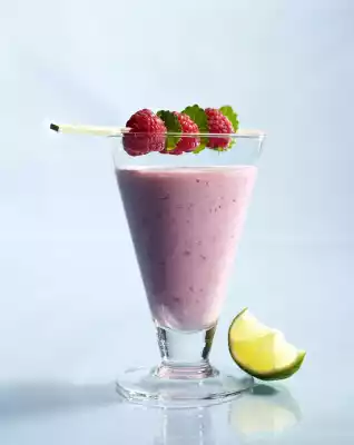 Defrost the raspberries. Put 3 very nice berries aside, add the rest to the kefir. Add honey and puree everything. Season with lime juice and pour into a glass. Wash lemon balm, dab dry and pluck leaves from the stalk. Put alternately 1 raspberry and a lemon balm leaf on the skewer, decorate glass with it