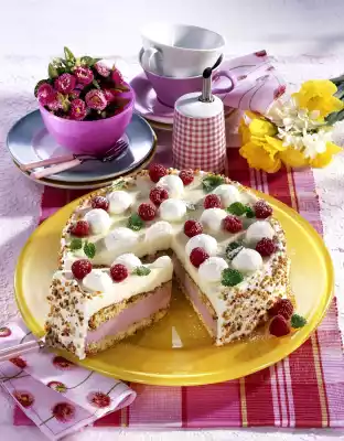 Whip 250 g cream until stiff. Spread half of the cream on the edge of the cake, sprinkle with the rest of the brittle. Decorate the cake with the rest of the cream and raspberries etc.