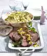Line a springform pan (26 cm Ø) at the bottom with baking paper. Separate the eggs. Beat the egg white until stiff, adding salt and 100 g sugar. Beat in the egg yolks one by one. Sift flour, starch and baking powder on top and fold in 80 g brittle. Brush into the mould. Bake in the preheated oven (electric cooker: 200 °C/ convection oven: 175 °C/gas: level 3) for approx. 25 minutes. Cooling down