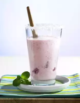 Dip glass rim first in lemon juice, then in grated coconut. Sort raspberries. Puree milk, lemon juice, syrup, oat flakes and fruit in a blender. Decorate with mint.