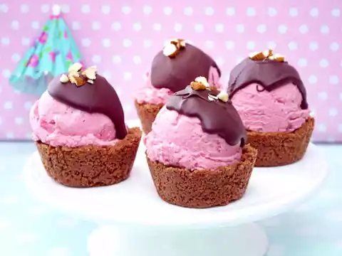 Mix the biscuits, liquid chocolate and butter. Spread the mixture into the hollows of the muffin tray and press it down, pressing up one edge. Chill for about 30 minutes.