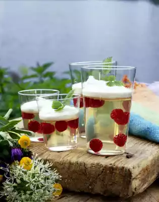 Soak gelatine in cold water. Select the raspberries, mix with sugar syrup and raspberry brandy and pour into transparent disposable cups. Squeeze out the gelatine, dissolve lukewarm. First stir 100 ml Prosecco into the hot gelatine, then stir the mixed gelatine into the rest of the Prosecco. Pour into the cups with the raspberry-syrup mixture and chill until the jelly is firm. For the cream, stir mascarpone, quark, sugar and lemon juice until creamy. Spread over the jelly