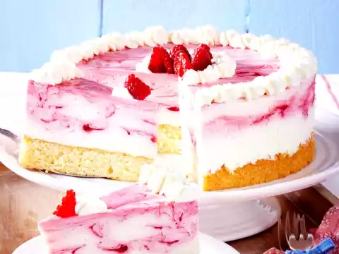 Add the rest of the quark mixture, add the rest of the raspberry mixture and swirl again. Chill the cake for at least 4 hours.