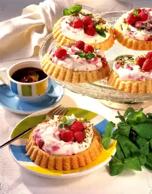 Fill the tartlets with raspberry quark. Decorate with the remaining raspberries and chopped pistachios