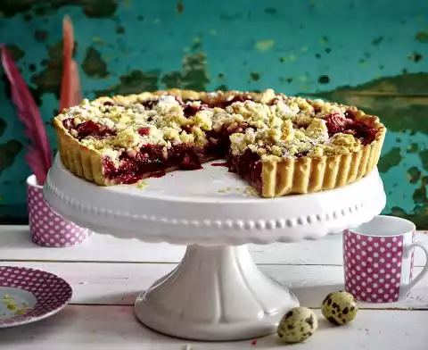 Roll out the dough to a circle (approx. 28 cm Ø) and line the mould with it. Spread raspberry-rhubarb compote evenly on the dough. Spread crumbles over the compote and bake in the preheated oven, bottom shelf (electric range: 200 °C/ convection oven: 175 °C/ gas: see manufacturer) for approx. 40 minutes. Place on the middle shelf about 10 minutes before the end of the baking time. Leave the finished tart to cool in the mould for approx. 10 minutes, then remove from the mould and lift onto a plate. Sprinkle with icing sugar. Serve lukewarm.