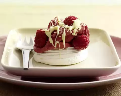 Spread ice cream on meringue shells and decorate with raspberries, chocolate and grated coconut. Serve immediately.