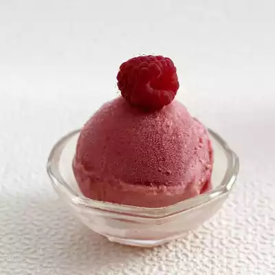 Soak gelatine in cold water. Simmer 250 ml water and sugar in a pot until the sugar is dissolved, remove from heat and allow to cool. Squeeze out the gelatine, dissolve in the still warm sugar water and let it cool down further. Sort the raspberries. Finely puree the sugar water, raspberries and lemon juice for about 3 minutes. Beat the egg whites and salt until stiff, carefully fold into the puree, which should be warm to the touch at most. Freeze the sorbet mixture in an ice-cream maker or put it in a flat, freezer-proof mould and freeze for 3-4 hours, stirring frequently