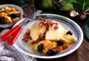 Let it cool down a little and stir in the egg yolk. Put some raspberries aside for decoration. Caramelise 5 tablespoons of sugar and 2 tablespoons of water in a pot until golden brown. Add the rest of the frozen raspberries and apple juice, boil off the sugar and simmer covered for about 5 minutes.