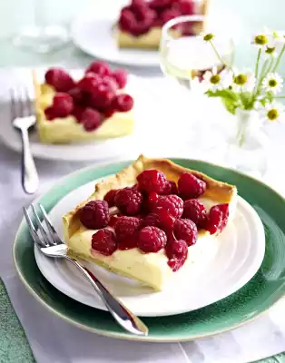 Cream the mascarpone with the whisk of the hand mixer. Beat the egg white until stiff. Alternately fold mascarpone and beaten egg white into the lemon cream. Lift the tart base out of the mould. Spread the cream on the tarte base and chill for about 1 hour. Sort the raspberries. Puree 50 g raspberries and 1 tsp. icing sugar and pass through a sieve. Spread the raspberries over the tart. Drizzle the puree over the raspberries