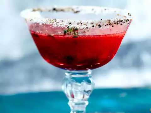 Defrost the raspberries. For the rim, squeeze lemons and pour juice, except for 2 tbsp, into a deep plate. Mix 2-3 tbsp sugar and 1 heaped tsp pepper on another plate. Dip four champagne glasses one after the other with the rim first in lemon juice and then press them into the sugar-pepper-mix.