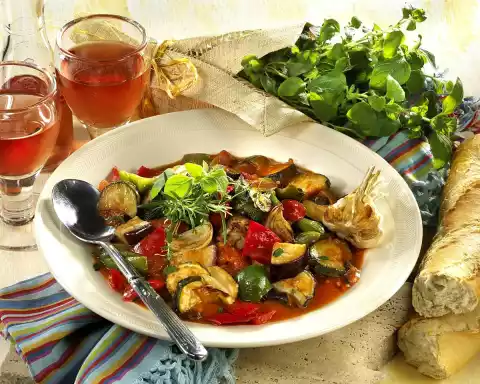 Peel garlic and chop finely. Pour hot water over the tomatoes and leave for about 3 minutes. Take out, peel skin. Cut the tomatoes into quarters. Heat 2 tablespoons of oil in a frying pan. Fry the vegetables (except the tomatoes), onions and garlic in it. Add tomatoes, stock, a pinch of sugar, pepper and 2 sprigs of rosemary, bring to the boil, cover and cook over a low heat for about 45 minutes. In the meantime, cut the garlic bulb in half. Pluck the marjoram and remaining rosemary needles from the stalks, wash, dab dry and chop finely. Heat 1 tablespoon of oil in a frying pan and fry the garlic for about 5 minutes until golden brown.
