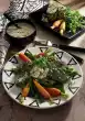 Fry the vegetables (except the tomatoes), onions and garlic in it. Add tomatoes, stock, a pinch of sugar, pepper and 2 sprigs of rosemary, bring to the boil, cover and cook over a low heat for about 45 minutes. In the meantime, cut the garlic bulb in half. Pluck the marjoram and remaining rosemary needles from the stalks, wash, dab dry and chop finely. Heat 1 tablespoon of oil in a frying pan and fry the garlic for about 5 minutes until golden brown. Take rosemary twigs from the vegetables and stir in chopped herbs. If necessary season with salt and garnish with herbs and garlic onion