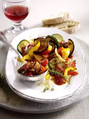 Heat 4 tablespoons of oil in a large frying pan. Fry the onion and bell pepper for about 5 minutes, turning them over. Add thyme, eggplant, zucchini and garlic. Season with salt, pepper and sugar, fry for another 5 minutes. Add chunky tomatoes, bring to the boil.