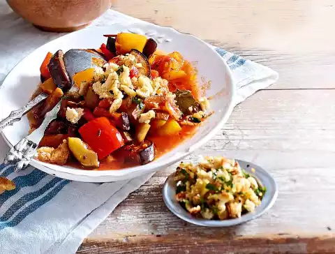 Season to taste with salt and pepper. Serve as a small extra topping with the ratatouille.