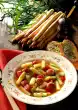 In the same pan, lightly fry the courgette, peppers and onion rings in the remaining oil, one after the other. Pour the prefried vegetables and tomatoes into a frying pan. Season with salt and pepper and fold in the herb mixture. Bring to the boil over medium heat, then finish cooking for 20 minutes. Season again and serve garnished with fresh herbs. Serve with lamb chops and fresh baguette