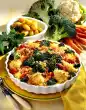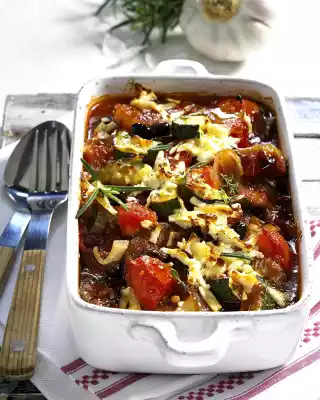 Add tomato paste and sweat briefly. Deglaze with 200 ml water and bring to the boil. Stir in stock and let it simmer for 2-3 minutes. Season to taste with salt and pepper. Coarsely grate feta cheese. Put the vegetables in an ovenproof dish and sprinkle cheese over them.