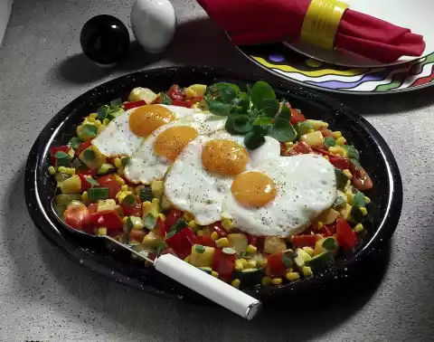 Baked potato with feta cheese, spring onions, olives and tomatoes