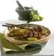 Stir in Fix for Ratatouille, bring to the boil and cook over low heat for about 12 minutes. Add meat, tomatoes and olives and warm up. Wash thyme, dab dry and pluck leaves from the stalks.