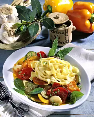 Heat the oil in a pot. Brown the vegetables in it. Stir in 3 tablespoons of water, stock and herbs. Bring to the boil, cover and stew for about 10 minutes. Season to taste. Drain the pasta and serve with the vegetables