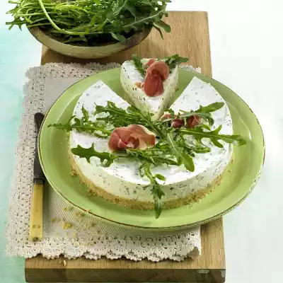 Stir droplets into the cream cheese mixture. Wash the rocket, dab dry and chop 2/3 roughly. Fold into the cream cheese mixture. Place the cream cheese mixture on the cracker base and smooth it down. Chill for 2 hours. Remove the cake from the edge of the springform pan with a knife. Cover with remaining rocket and Parma ham