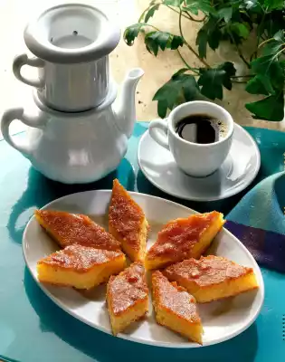 Pour the syrup over the cake. Cut the cake into lozenges.