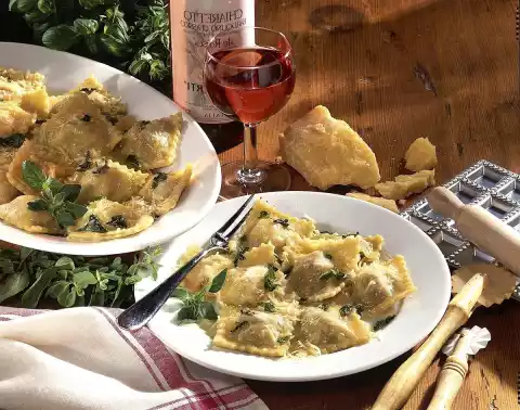 Place the filling with a teaspoon on a pasta plate at a distance of 2-3 cm. Brush the spaces in between with a little water and place the second pastry sheet on top. Press the spaces around the filling with a long spoon handle. Using a pastry wheel, roll out 5-6 cm ravioli and cook in portions in plenty of boiling salted water for 5-6 minutes. Melt the remaining butter and add the remaining chopped herbs. Drain the ravioli, pour hot butter over them and sprinkle with the remaining Parmesan cheese. Serve immediately garnished with herbs. Makes about 32 pieces