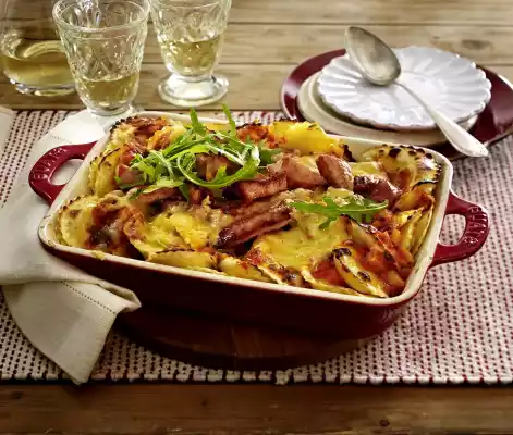 Remove the casserole, let it cool down a little, garnish with rocket and serve immediately