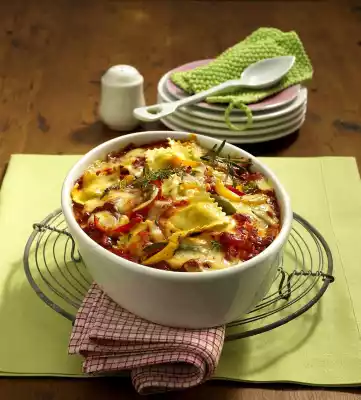 Drain and let drain. Drain mozzarella and cut into cubes. Layer ravioli, paprika-tomato sauce and cheese alternately in a greased casserole dish. Finish with cheese. Bake in the preheated oven (electric cooker: 200 °C/ convection oven: 175 °C/ gas: level 3) for 20-25 minutes. Garnish with rosemary and thyme