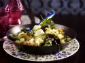 Stir the sauce thickener into the sauce and cook for about 1 minute, finally adding the chopped mint. Drain the ravioli. Arrange ravioli and sauce and garnish with mint leaves, lemon zests and coloured pepper.