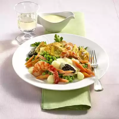 Heat the fat in a pot. Dust with flour and sweat on. Deglaze with 1/4 litre vegetable stock and milk while stirring. Add morels and simmer for about 5 minutes. Meanwhile wash the prawns, peel them down to the tail fin and remove the intestines. Dab shrimps dry. Heat 1 tablespoon of oil in a frying pan and fry the prawns for 2 minutes on each side. Season with salt and pepper. Heat 1 tablespoon of oil in another pan and fry the ravioli until golden brown all around. Whisk the cream and egg yolks, stir into the sauce, but do not boil any more. Season to taste with salt, pepper, nutmeg and lemon juice. Put the vegetables and prawns into the hot sauce and warm them up.