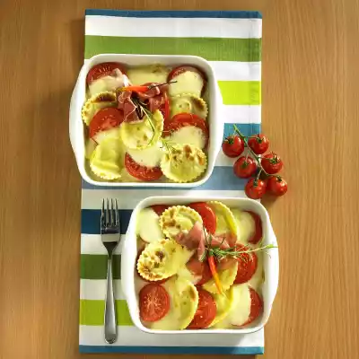Cut the mozzarella into slices. Spread the prepared ingredients in 4 casseroles in slightly flaky form. Sprinkle with another 4 tablespoons of olive oil and bake in a preheated oven (electric cooker: 200 °C/ convection oven: 175 °C/ gas: level 3) for approx. 15 minutes. Serve with Parma ham. Serve garnished with rosemary and chilli