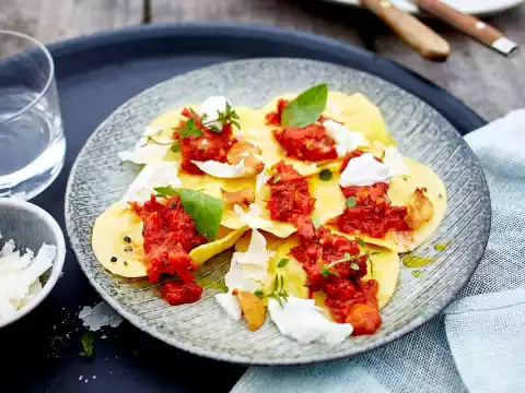 Bring 3-4 l salted water (1 teaspoon salt per litre) to the boil. Whisk the egg yolk and 4 tablespoons of water. Quarter the dough, roll out thinly one after the other with the pasta machine. Spread a thin layer of egg yolk on 2 plates. Spread the mozzarella filling with a tablespoon at a distance of about 5 cm. Carefully place the remaining pastry plates on top, press them down and cut out ravioli with a ravioli stamp (approx. 5 cm Ø).