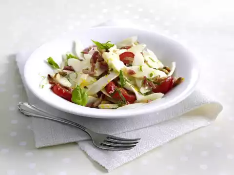Roast pine nuts in a pan without fat. Wash the tomatoes and cut into thick slices. Wash the basil, dab dry and cut the leaves of 2 stems into strips. Add basil strips and pine nuts to the asparagus and mix well. Season salad with salt, pepper and a little sugar and garnish with basil