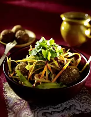 Heat 2 tablespoons of oil in a frying pan. Fry the green spelt balls for about 4 minutes while turning. Wash and quarter the apple and remove the core. Grate the apple quarters. Add chopped coriander, grated apple, walnuts and sultanas to the salad and mix. Arrange salad and green spelt balls in bowls and sprinkle with the coriander leaves