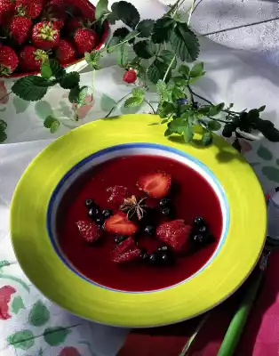 Wash, clean and halve the strawberries. Select the raspberries and blueberries, wash carefully and drain. Stir 4 tablespoons currant juice and pudding powder until smooth. Boil up the rest of the currant juice and cherry nectar. Season with sugar, lemon juice and aniseed. Stir in the pudding powder and bring to the boil while stirring. Fold in the berries and let cool off