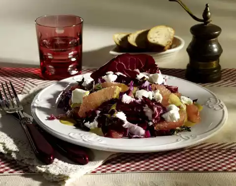 Clean and wash the radicchio and arrange on plates with the red cabbage salad. Coarsely crumble cheese taler over the salad, garnish with thyme. Serve with wholemeal baguettes.