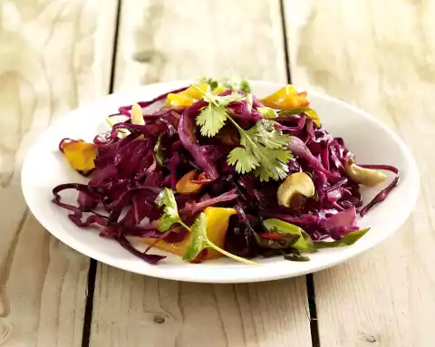 Heat oil in a large wok. Roast the cashew nuts for approx. 4 minutes while turning. After about 3 minutes add chilli rings. Remove from the pan and fry the red cabbage and spring onion rings in nut fat for about 5 minutes