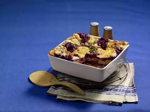 Put 1/4 of the sauce into the casserole dish and cover with 2 noodle sheets. Layer half of the minced sauce and 1/3 béchamel on the noodle leaves, then cover again with 2 noodle leaves. Add half of the red cabbage. Layer the remaining ingredients in the same way. Pour the rest of the sauce onto the cabbage and sprinkle with Parmesan cheese. Bake in the preheated oven (electric range: 200 °C/ convection oven: 175 °C/ gas: level 3) for 40-45 minutes until golden brown. If the surface becomes too dark, cover with aluminium foil. Garnish finished lasagne with thyme