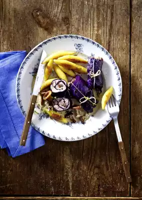 Clean the red cabbage, cut out the stalk in a wedge shape. Boil water in a large pot. Add the cabbage. After about 5 minutes, remove the cabbage and cut off the outer leaves. Repeat the process and remove a total of 12 large leaves. (The rest of the cabbage can be used for other purposes.) Dab the leaves dry and cut the thick veins of the leaves flat