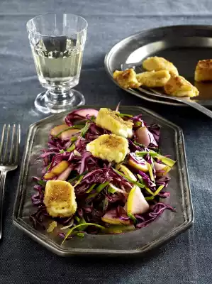 Cut the cheese into bite-sized pieces. Whisk the egg in a deep dish. Turn the cheese pieces in portions one after the other first in flour, take them out and tap them lightly. Then pull through the egg and turn it in breadcrumbs. Heat the oil in a large pan and fry the cheese cubes for 2-3 minutes while turning. Mix red cabbage, pears and leek and season to taste if necessary. Arrange salad and cheese on plates
